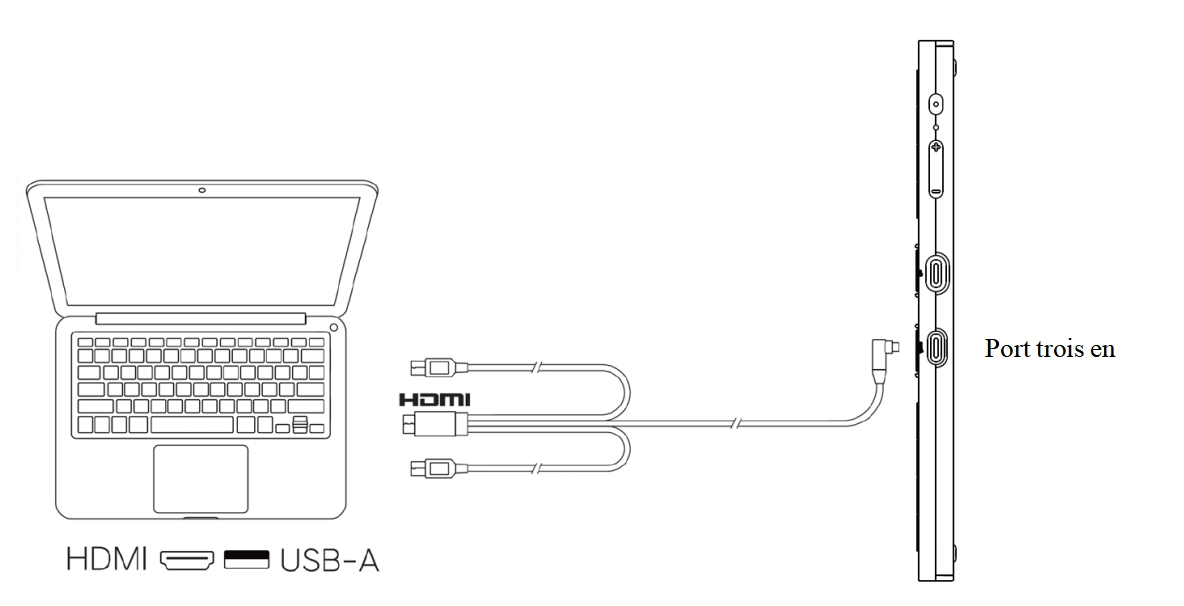 2. Branchez le câble USB-C sur le port trois en un marqué sur la tablette graphique avec écran ;