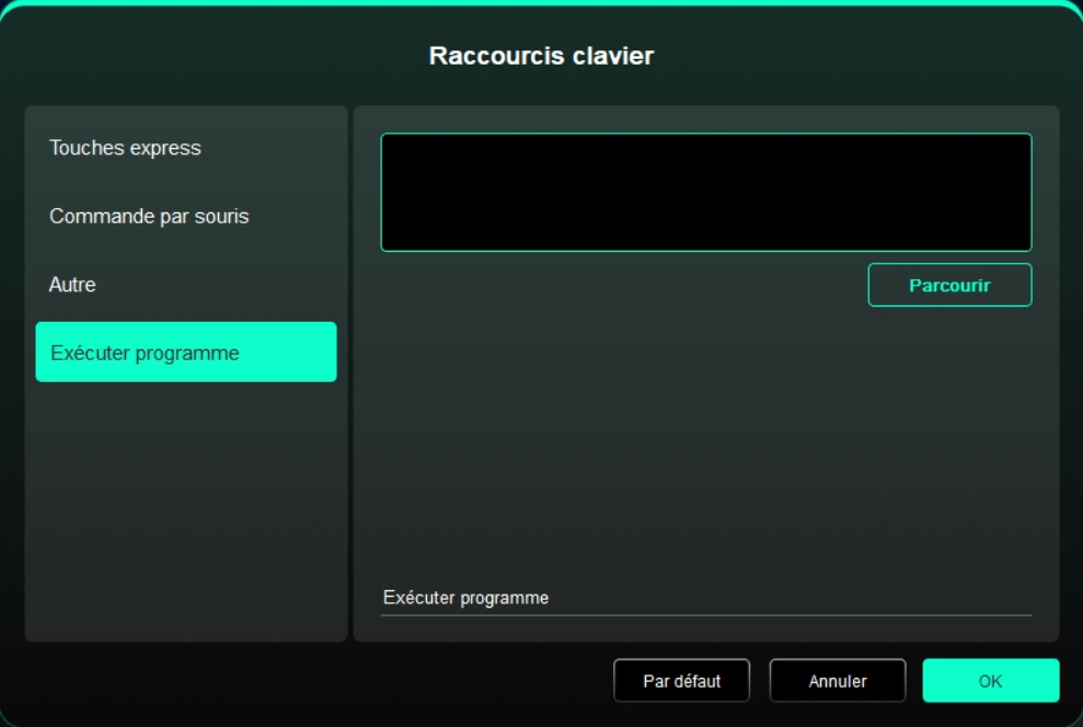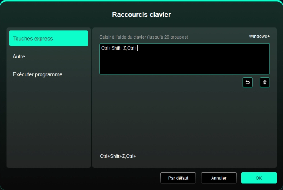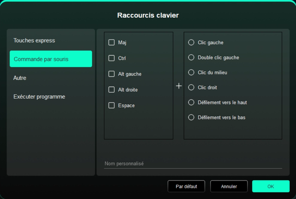 On peut configurer des combinaisons de touches clavier et d'actions de souris. Par exemple, en choisissant la combinaison « Shift » et « clic », cette opération de raccourci peut être réalisée dans les logiciels qui la prennent en charge.