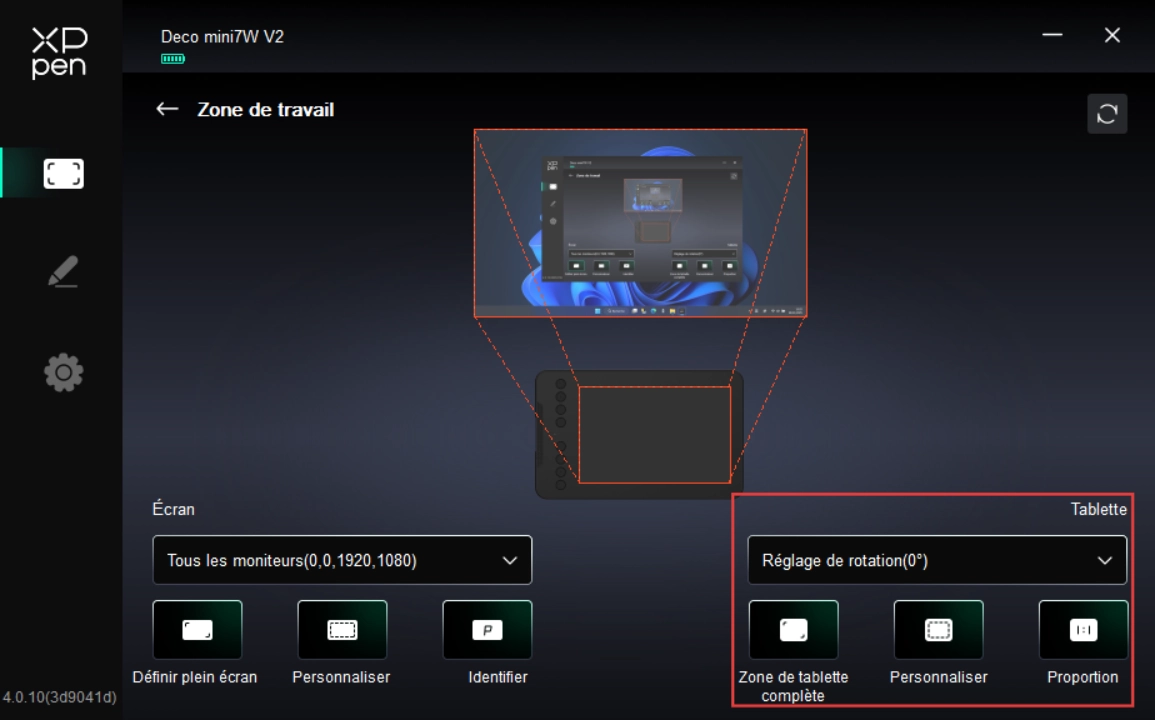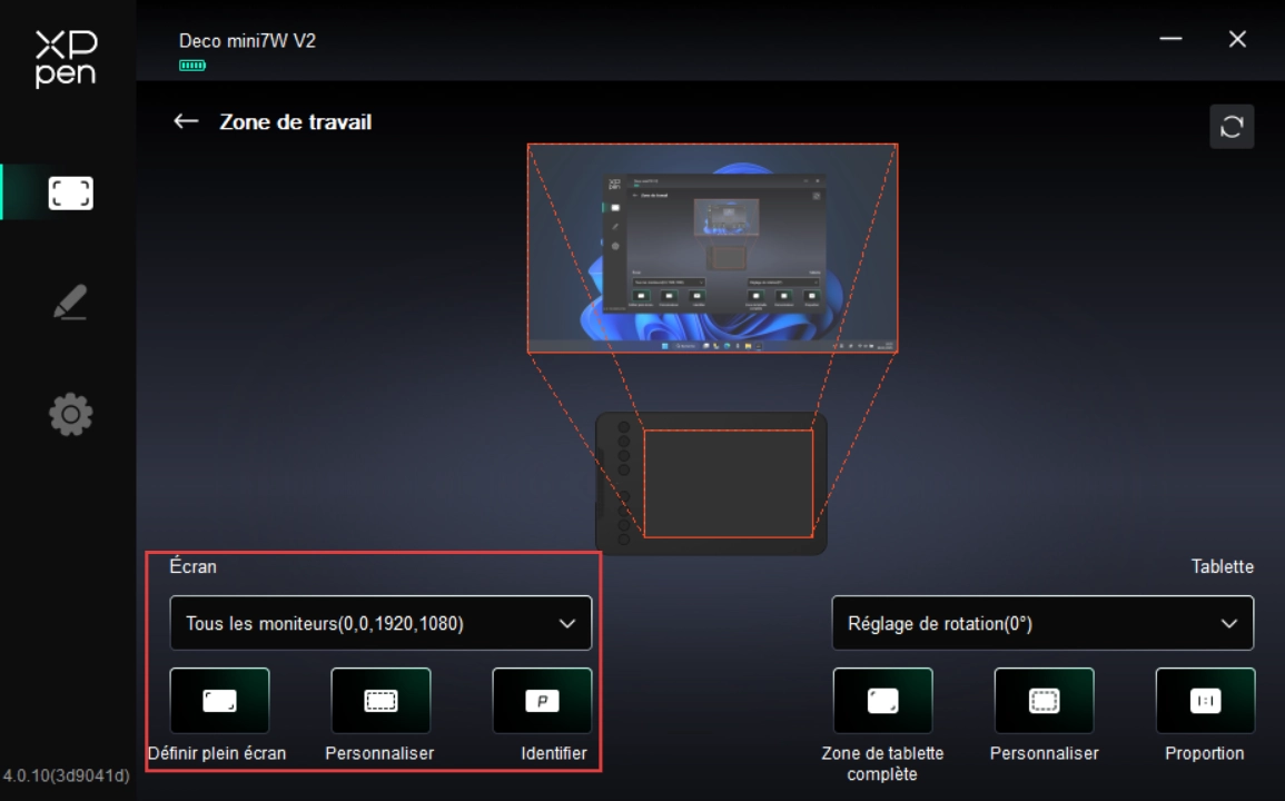 Si vous utilisez plusieurs écrans configurés en mode étendu, veuillez sélectionner, dans l'onglet « Écran », l'écran sur lequel la zone de travail du périphérique doit être mappée.
