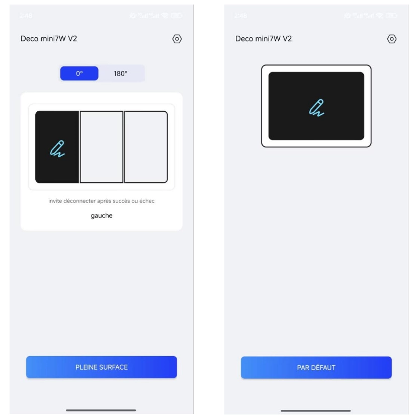 1) L'orientation par défaut de la tablette à stylet est de 0°, sa zone de dessin se situe à gauche, et il est possible de basculer entre les trois positions : gauche, centrale et droite.